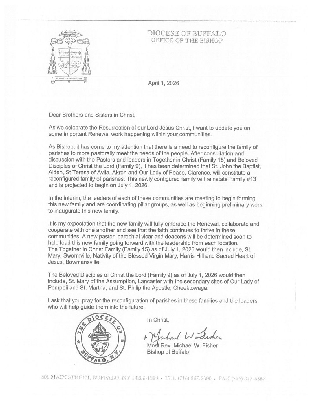 St. John the Baptist Parish is a faith-filled Catholic Christian Community. We are part of the Beloved Disciples of Christ the Lord Family of Parishes. We believe in the Lord Jesus Christ, in His Church and its teachings, under the direction of our spiritual leaders.