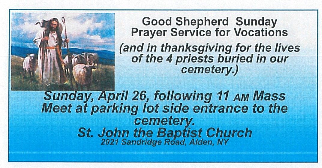 Sunday - April 26th - Good Shepherd Sunday - Prayer Service for Vocations - following the 11am Mass - see flyer at the bottom for more information.